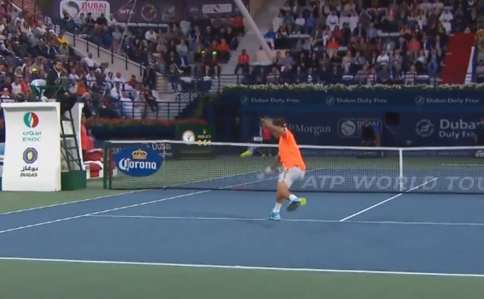 C’est qui le patron ? “Rodgeur”, pour le moment. Le jeune Borna Coric, 18 ans, n’a pas existé contre Roger Federer en demi-finales du tournoi de Dubaï 2015. Après avoir battu Andy Murray, le Croate a pris 6/2 6/1 face à la légende du tennis et il a notamment fait connaissance avec la créativité du Suisse au cours de cette rencontre comme sur cette volée amortie superbe à la fin du match. Surpris, Coric pose même la main à terre pour garder l’équilibre.