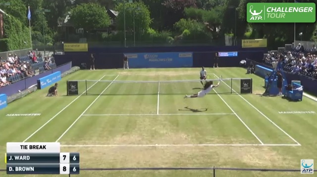 Balle de set à 8-7 au tie-break du premier set ? Pas de problème, si je faisais une des volées de l’année pour conclure la manche. Dustin Brown a encore frappé en quarts de finale du Challenger de Manchester 2016. L’Allemand s’est envolé sur une balle de set en sa faveur en faisant un plongeon monstrueux.