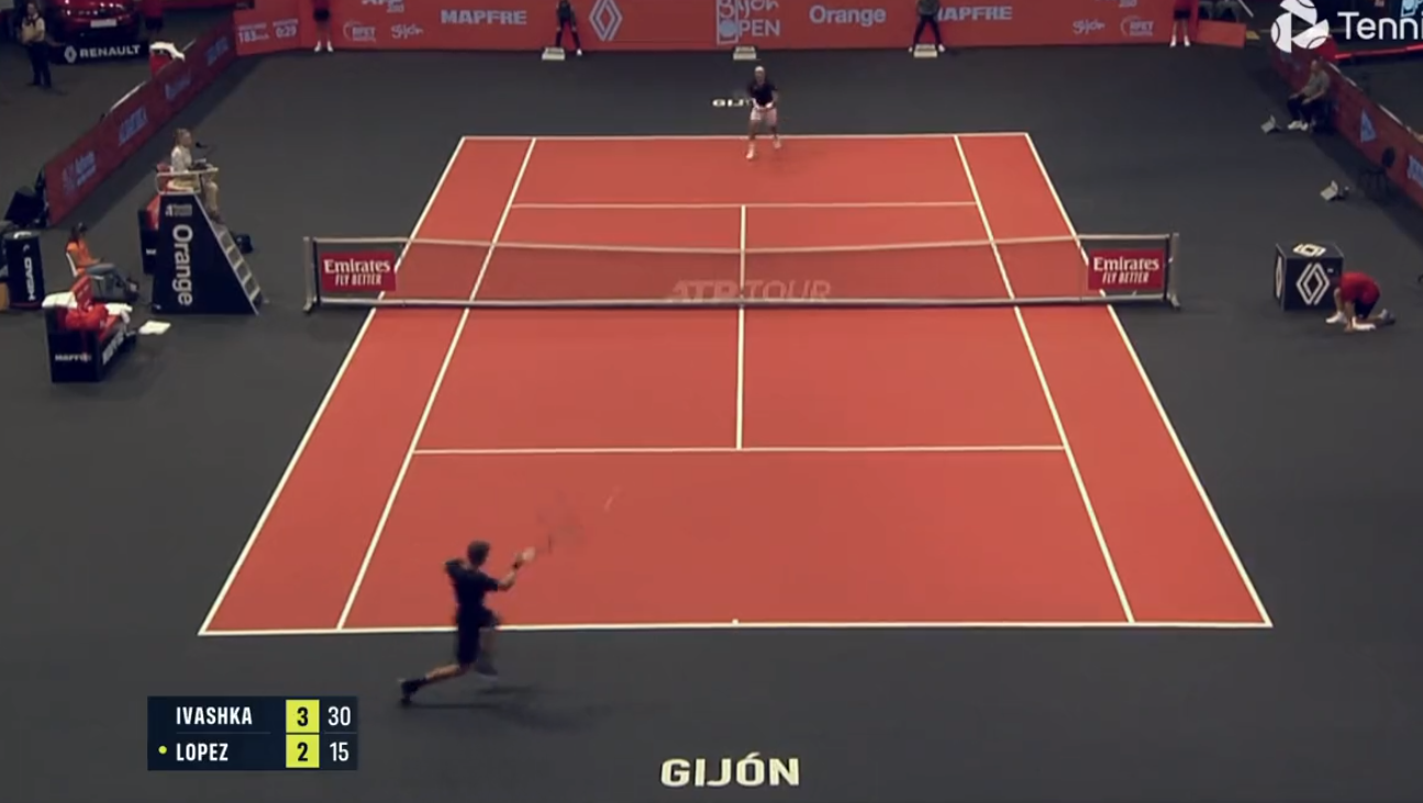Mettre un retour gagnant sur un service à 226 km/h est assez rare sur le circuit. Il faut un timing parfait et, évidemment, que le service ne soit pas bien placé pour avoir une chance de contacter correctement la balle. Ilya Ivashka a réussi ce retour à l’envoyeur parfait sur une marmite de Feliciano Lopez au premier tour du tournoi de Gijon 2022. PAN !