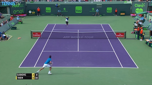 Le n°1 mondial Novak Djokovic n’a pas puisé dans ses réserves (6/3, 6/4) pour écarter Dominic Thiem en huitièmes de finale du Masters 1000 de Miami 2016. Le hot shot de la rencontre a néanmoins été décerné à l’Autrichien pour une volée de revers slicé absolument somptueuse. Même le Serbe a applaudi.