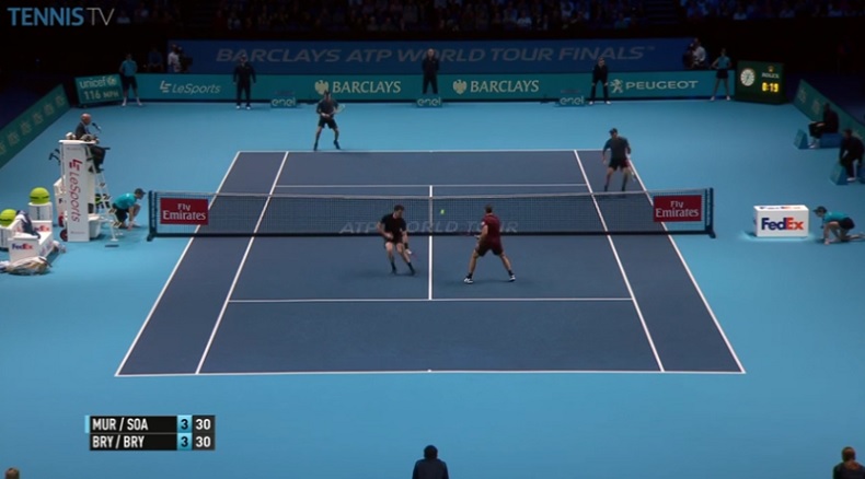 Jamie Murray et Bruno Soares, n°2 mondiaux en double, ont dominé les frères Bryan (6/3, 6/4) lors de leur deuxième match dans la phase de poules du Masters 2016 et le frère d’Andy s’est montré à deux reprises impressionnant au niveau des réflexes, surtout sur une volée dans la première manche.