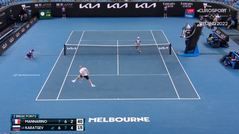 Le Français a tout d’abord improvisé en faisant un lob sur un frontal tweener, le Russe lui a répondu avec un coup entre les jambes classique, puis Manna a conclu le point au filet. Le tennis qu’on aime.