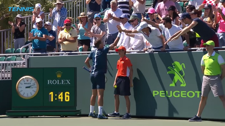 Vasek Pospisil a gagné un point monumental de 33 frappes face à Marin Cilic au troisième tour du Masters 1000 de Miami 2018. Pendant 32 frappes, le Canadien a subi les coups de massue du n°3 mondial, puis un miracle est survenu sur la 33e. Avec l’énergie du désespoir, le natif de Vernon a tenté le tout pour le tout et il a lâché un coup droit monstrueux pour s’en sortir. Cela valait bien une standing ovation et quelques “high fives” avec les spectateurs.