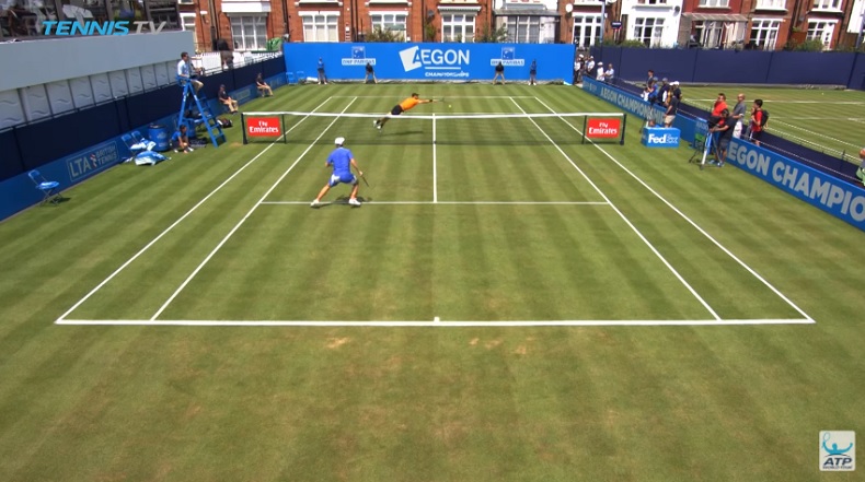 En un point face à son compatriote Stefan Kozlov au premier tour du Queen’s en 2017, l’Américain Steve Johnson a montré deux des particularités majeures du tennis sur gazon. Premièrement, les appuis sont mis à rude épreuve et les glissades récurrentes. Deuxièmement, les plongeons sont monnaie courante. Les deux enchaînées donnent un échange spectaculaire et l’envolée du 25e joueur mondial pour claquer la volée gagnante est fabuleuse.