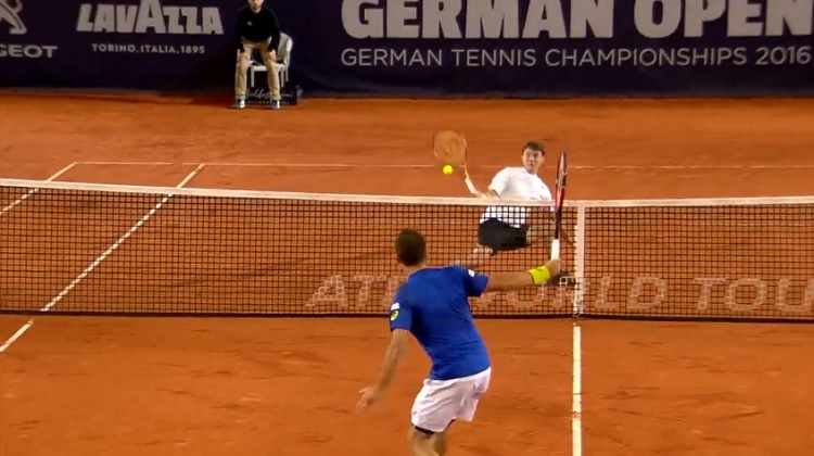 Renzo Olivo, 153e mondial, a créé la surprise au tournoi de Hambourg 2016 en dominant Philipp Kohlschreiber, 22e mondial, en quarts de finale (1/6, 6/0, 7/5). L’Argentin était pourtant breaké dès le début du troisième set mais il a recollé au score sur un point spectaculaire en effectuant une volée réflexe gagnante en tombant. Enorme !