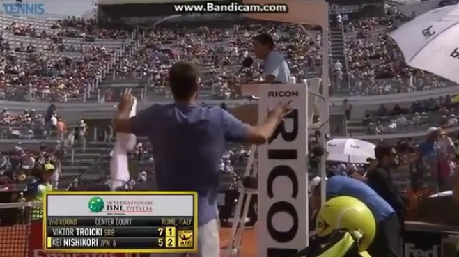 Au Masters 1000 de Rome, Viktor Troicki a quelques problèmes à accepter les décisions arbitrales en sa défaveur. En 2013, il était allé jusqu’à embarquer un caméraman sur le court pour tenter de prouver que Cédric Mourier avait tort. En 2016, alors qu’il menait 7/5, 1/1 au deuxième tour contre Kei Nishikori, le Serbe a carrément mis en doute l’impartialité des arbitres avec les meilleurs joueurs du circuit.