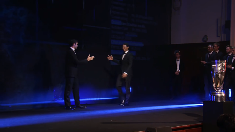 « Je n’aurais jamais pensé vous présenter ce joueur un jour dans ma vie, alors, par où dois-je commencer ? Tout commença il y a bien longtemps (ndlr : en 2004 précisément), un petit gars originaire de Manacor est venu à Miami et m’a battu lors de notre première rencontre, quand j’étais numéro 1 mondial. J’ai pensé qu’il allait probablement gagner Roland Garros une fois, mais j’étais loin d’imaginer qu’il allait en gagner 10 (Ndlr : 11 désormais en 2018). Tu as eu une carrière absolument incroyable et c’est merveilleux de t’avoir dans notre équipe. Veuillez accueillir Rafa Nadal. »
