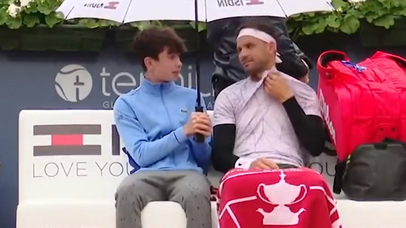 Partager la publication "La belle image de Grigor Dimitrov discutant sur son banc avec un ramasseur pendant une interruption par la pluie (Barcelone 2022)"