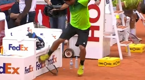 Fabio Fognini est un habitué de la rubrique “Pétages de plombs” sur Tennis Legend et l’Italien a encore innové au deuxième tour du tournoi de Hambourg 2014. Tenant du titre, il ne s’est pas seulement contenté de brader le deuxième set contre le Serbe Filip Krajinovic, 149e mondial, 6/4 6/0. Le Transalpin a également été inventif pour briser une énième raquette cette saison. Il s’en est occupé en mode karatéka en la cassant avec un chassé précis et efficace.