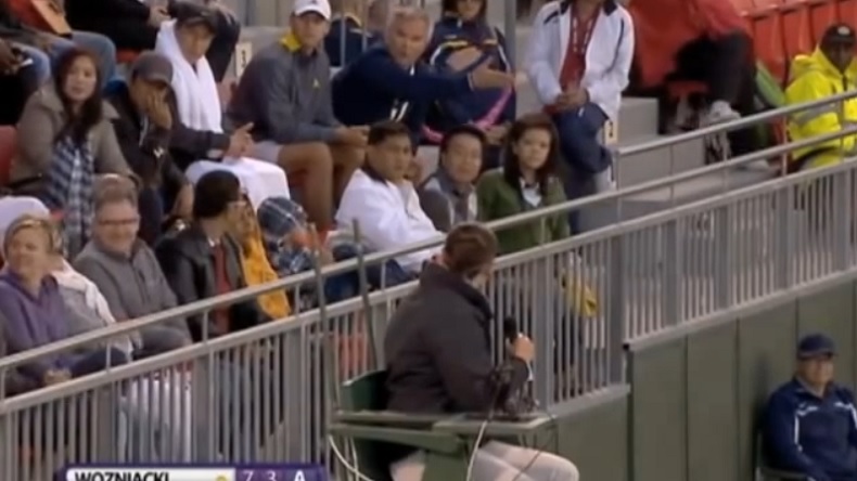Tout part d’un revers de l’Allemande annoncé “out” par un spectateur selon le commentateur. Le juge de ligne, placée derrière Wozniacki, fait en effet le signe que la balle est bonne sur les images, ce que semble expliquer l’arbitre à la Danoise, qui conteste. La situation est difficile à analyser car il est impossible de savoir si l’arbitre avait prévu de rejouer le point avant que le père de la Scandinave ne s’adresse directement à elle. Toujours est-il que la femme sur la chaise a opté pour cette décision après s’être fait interpeller, voire engueuler, par papa Piotr.